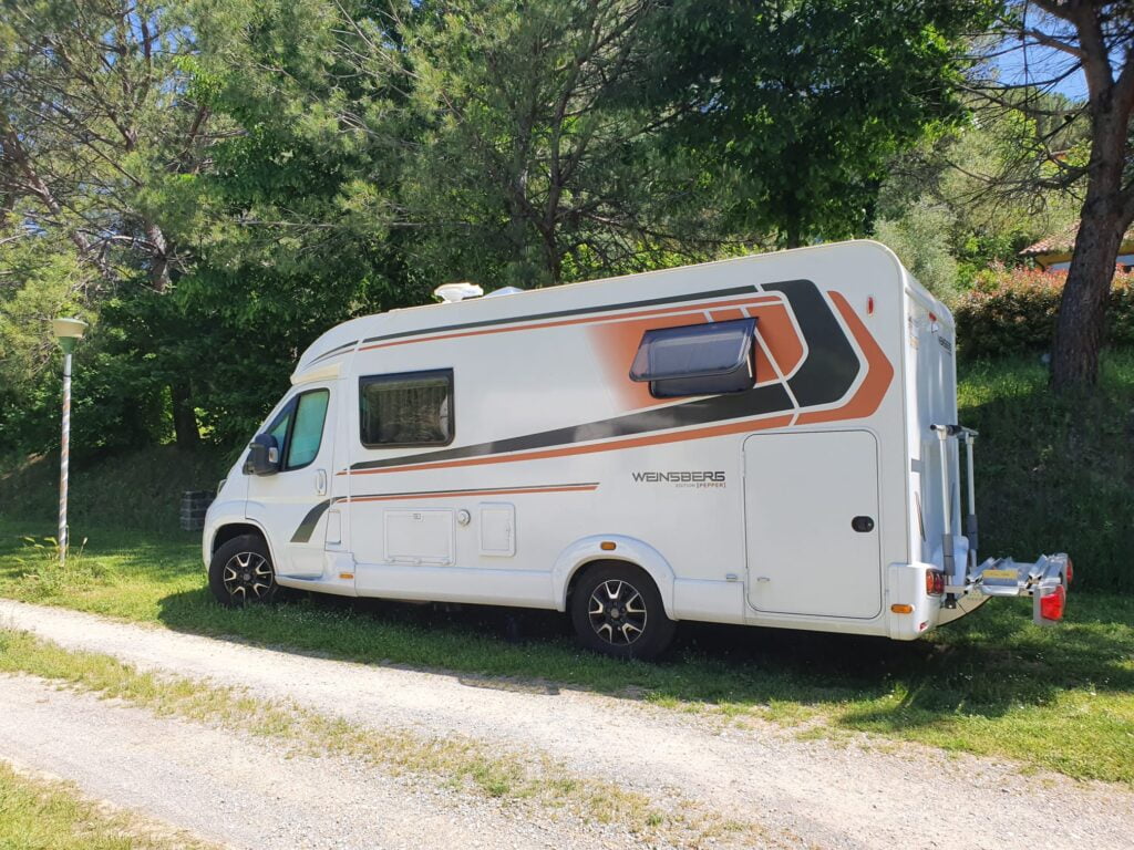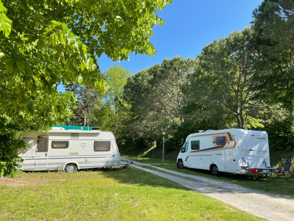 Our 135 plots are set in a small pine forest surrounded by a selection of fruit trees so we can offer both shade or sunny plots and our average plots are between 70-100 m2. We are located on a hill in the valley of the Arno river in a mixed grove of cypresses, pines and fruit trees.