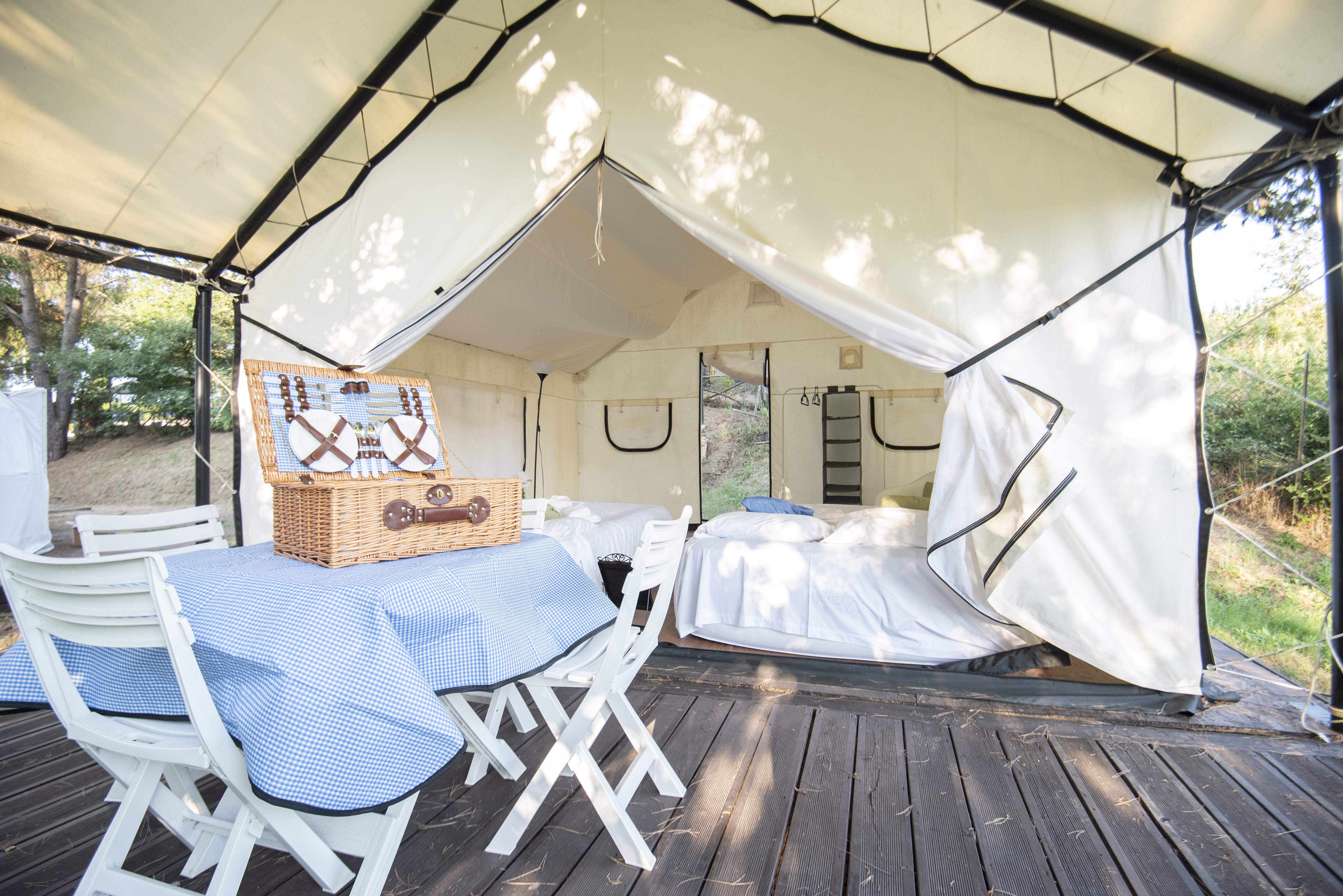 Il Tipi può ospitare comodamente 2 persone ed è dotato anche di 1 divano letto matrimoniale ed è completamente attrezzato, compreso frigorifero, barbecue, tenda da bagno privata, tavolo/sedie esterne e un grande ventilatore.